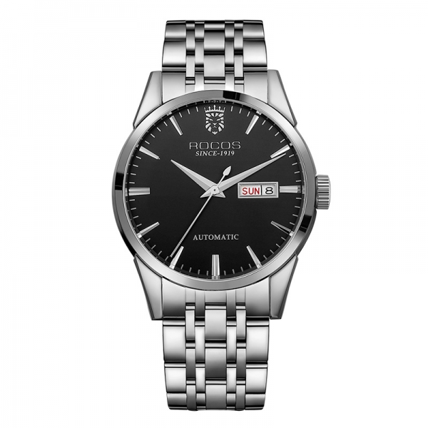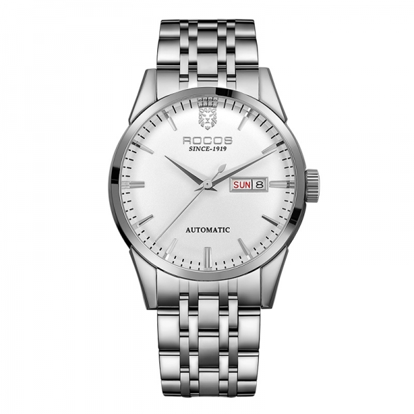 这款41毫米的精钢腕表,表圈镌刻立体钉条刻度,洁白银表盘干净整洁,3点钟位置设有日历和星期窗口。立体菱形时分指针,雷克斯品牌标识、红色星期搭配以及小时刻度与白色表盘形成经典对比。